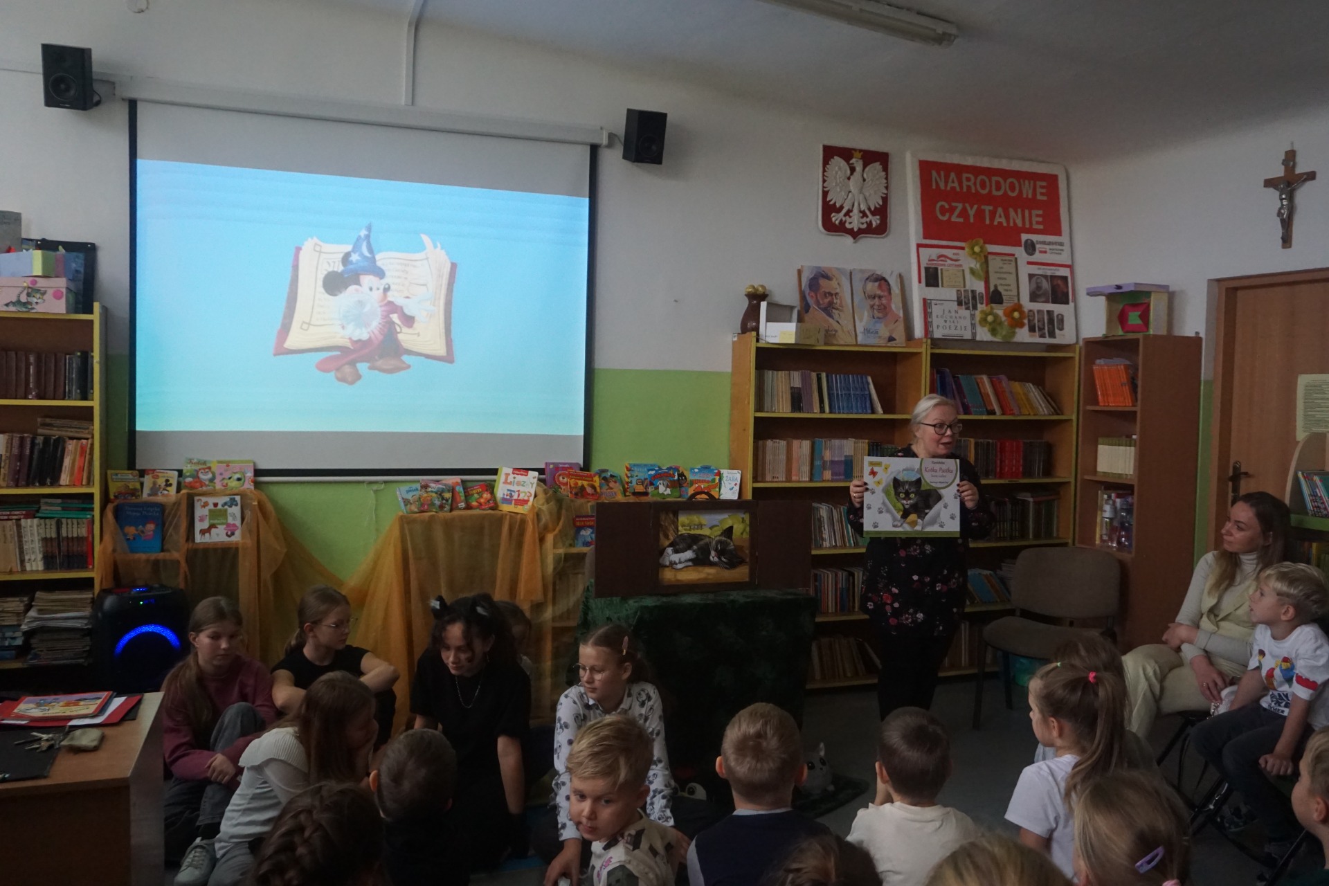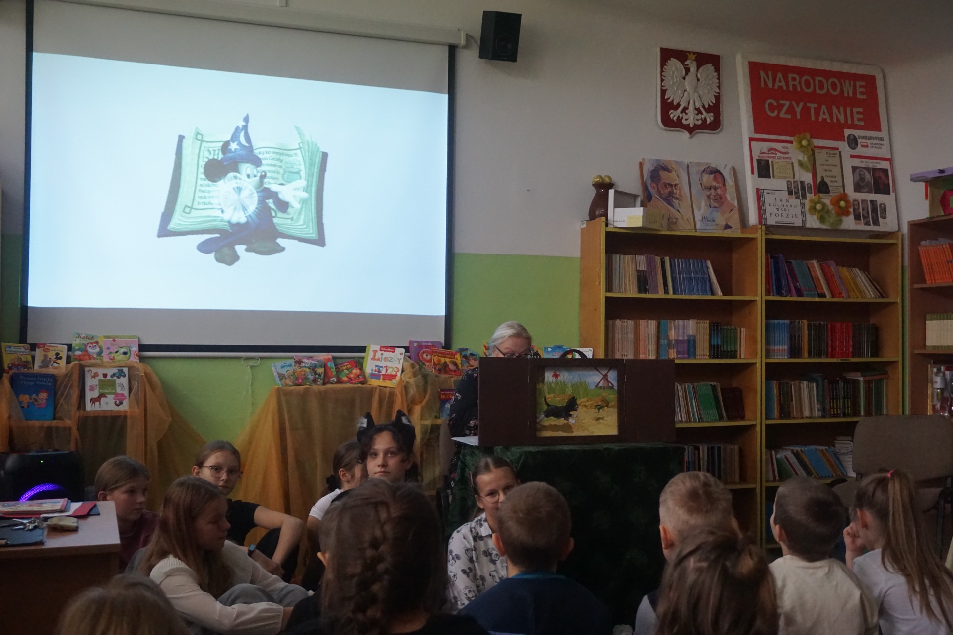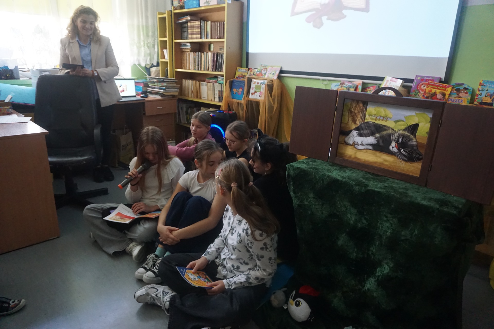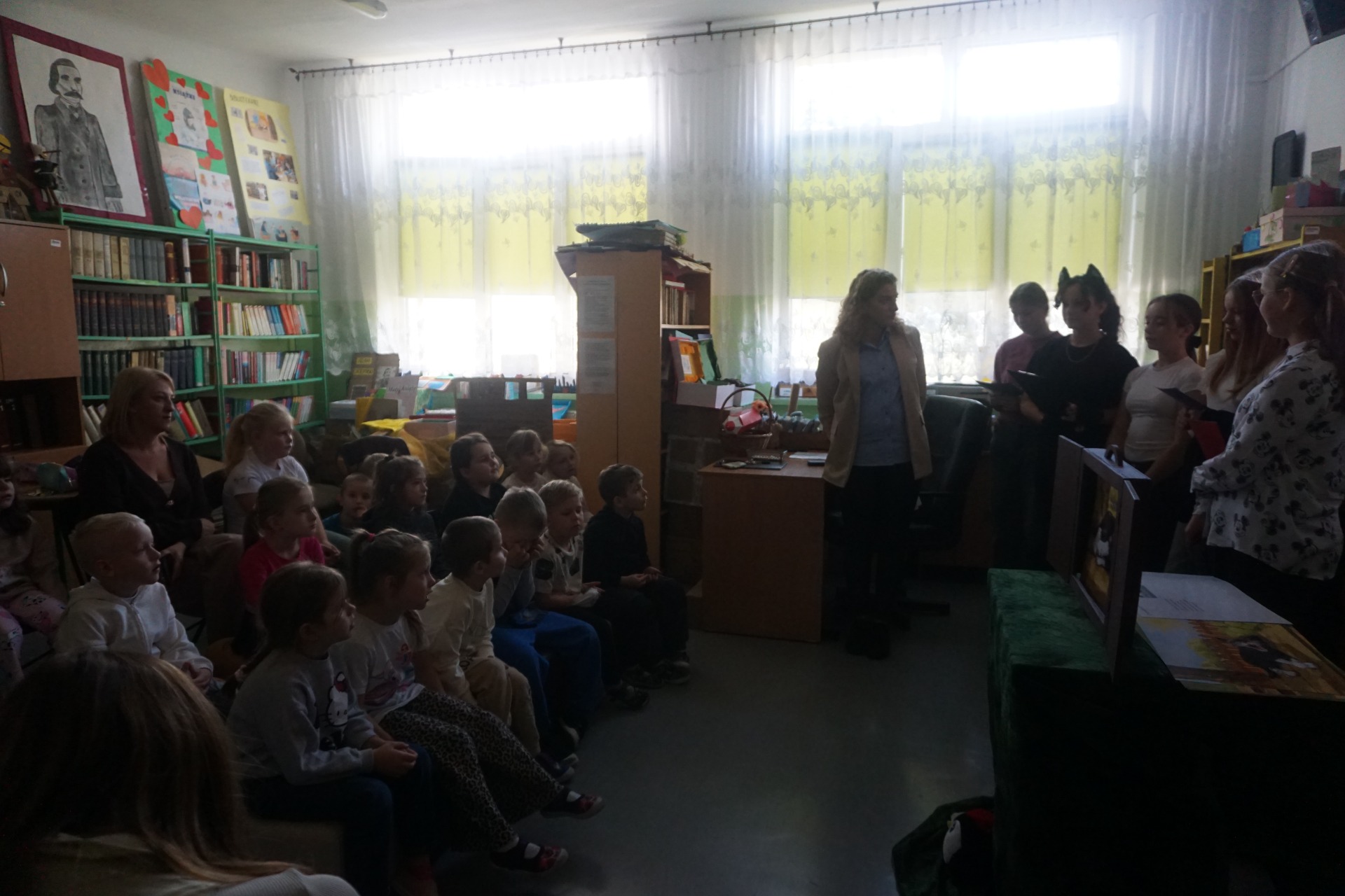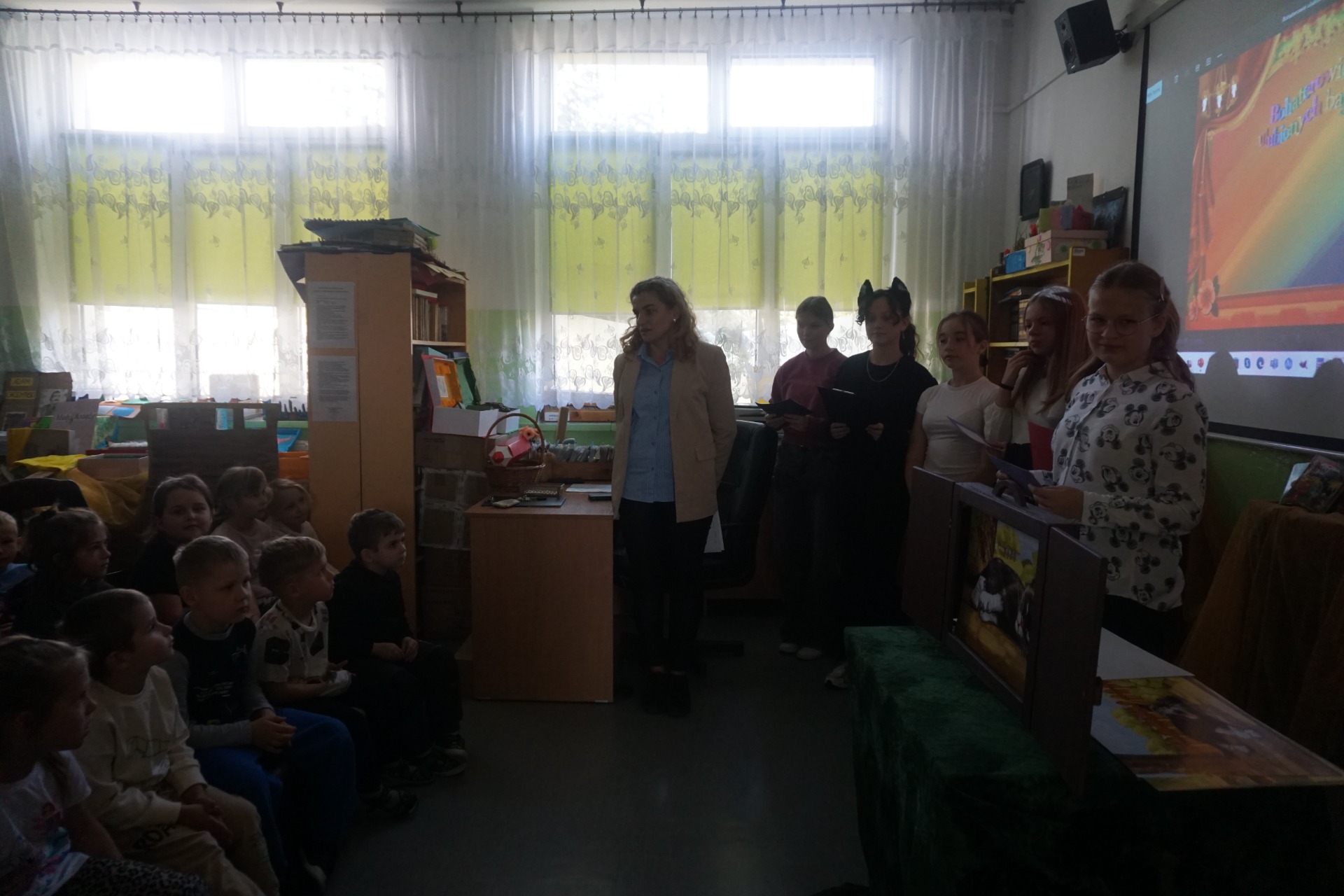 Z okazji Dnia Postaci z Bajek przedszkolaki odwiedziły szkolną bibliotekę, gdzie czekały na nie wyjątkowe zajęcia czytelnicze. Dzieci wysłuchały zagadek o bohaterach bajek oraz czytanych przez uczennice klasy 5 opowiadań pt. "Kicia Kocia." Następnie obejrzały teatrzyk kamishibai pt. „Kotka psotka” przygotowany przez szkolnego bibliotekarza.