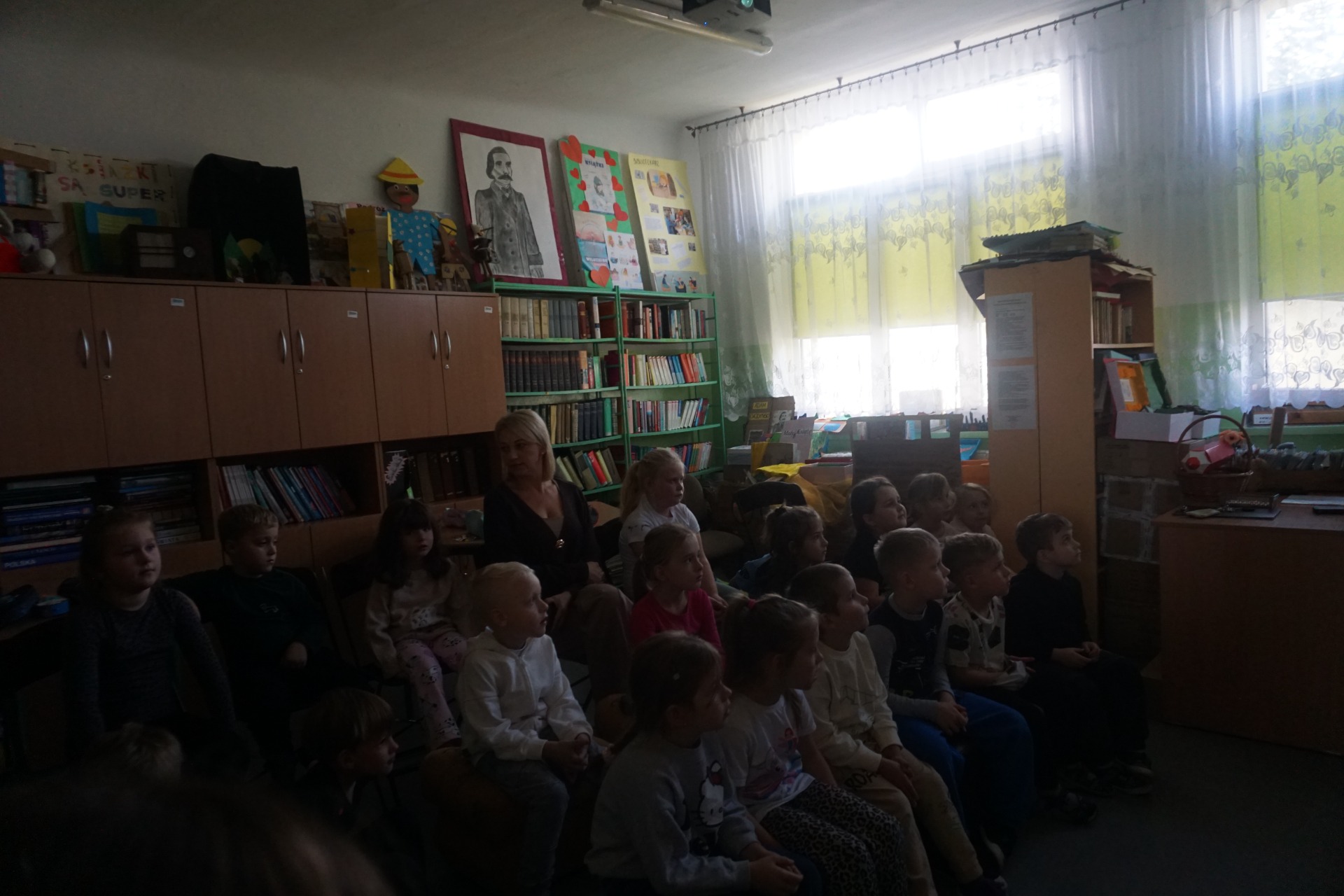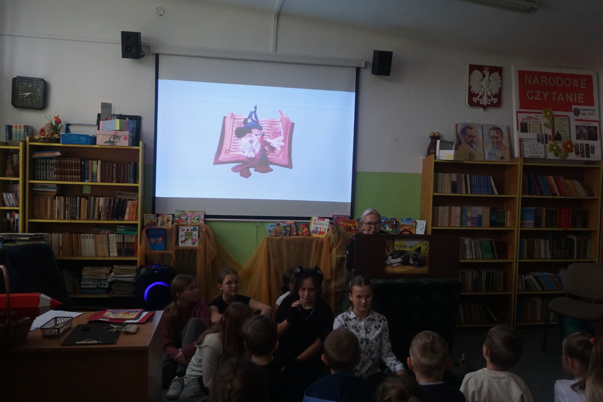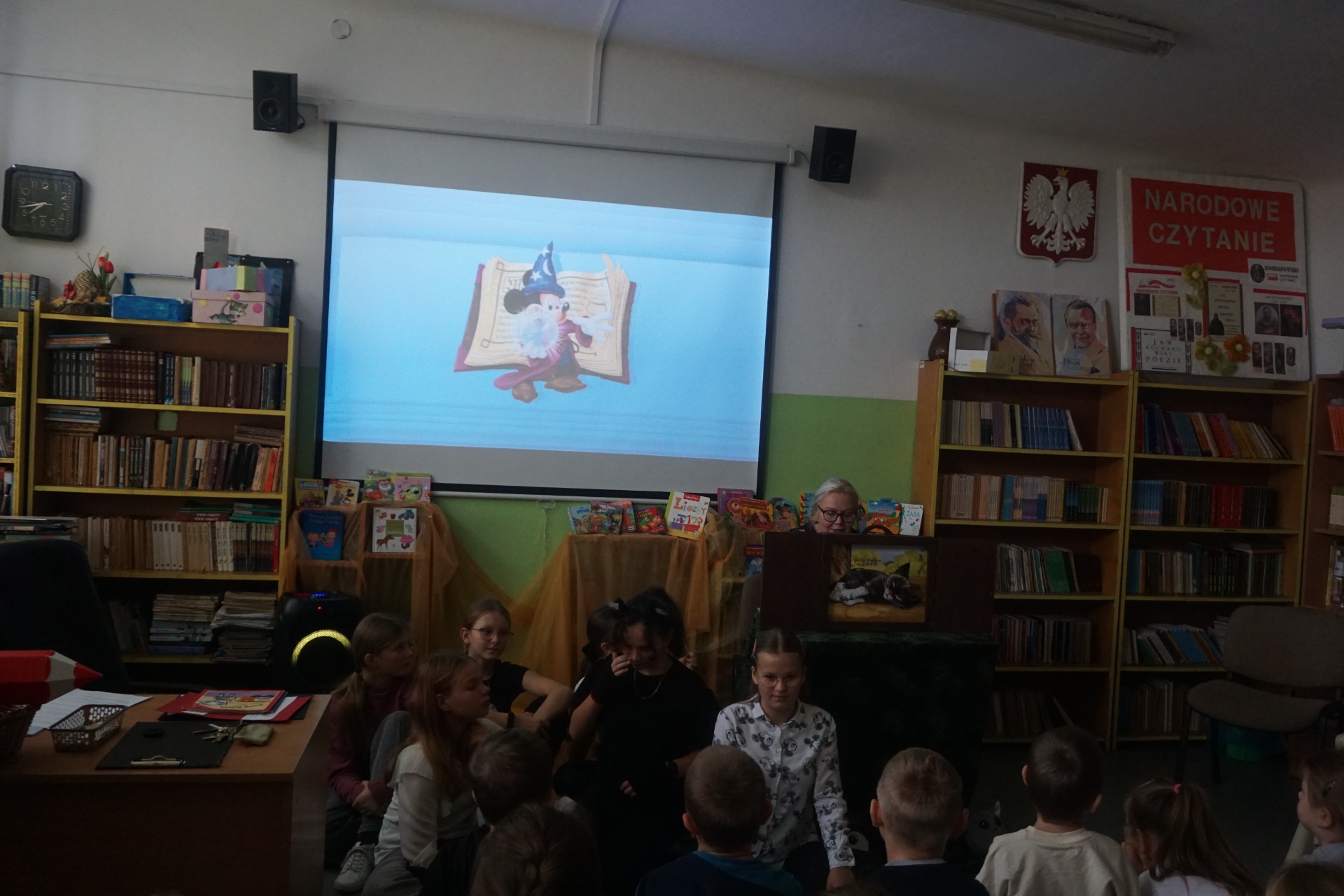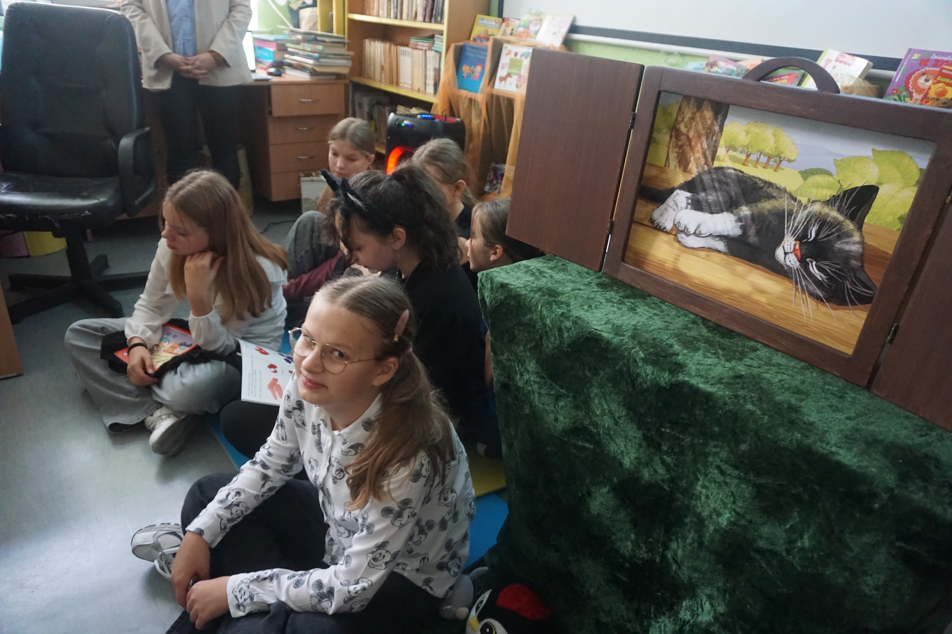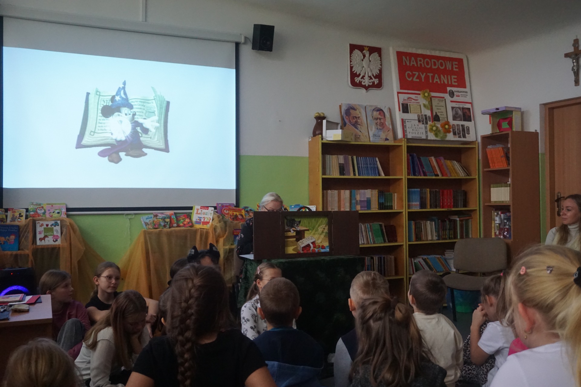 Z okazji Dnia Postaci z Bajek przedszkolaki odwiedziły szkolną bibliotekę, gdzie czekały na nie wyjątkowe zajęcia czytelnicze. Dzieci wysłuchały zagadek o bohaterach bajek oraz czytanych przez uczennice klasy 5 opowiadań pt. "Kicia Kocia." Następnie obejrzały teatrzyk kamishibai pt. „Kotka psotka” przygotowany przez szkolnego bibliotekarza.