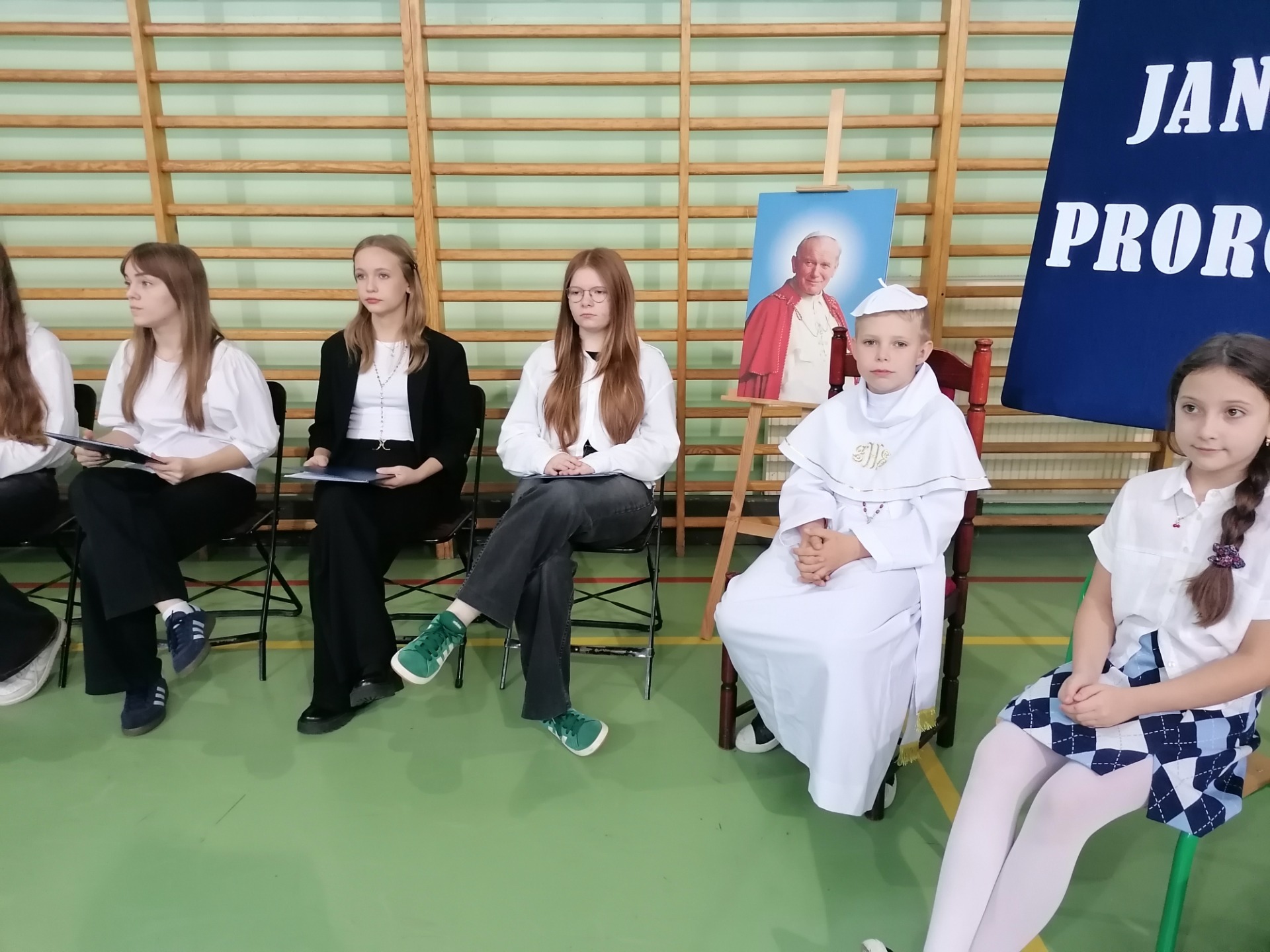 Dnia 24 października 2025 odbył się w naszej szkole uroczysty apel z okazji Dnia Papieskiego pod hasłem „Św. Jan Paweł II – Prorok Nadziei”. Podczas uroczystości nie zabrakło pięknych pieśni religijnych, które wprowadziły całą społeczność szkolną w atmosferę refleksji i zadumy, a także wzruszających słów o Papieżu, jego naukach oraz wielkiej roli, jaką odegrał w historii Polski i świata. Szczególną uwagę w trakcie apelu zwrócił uczeń klasy IV – Mikołaj, który wcielił się w postać Papieża Jana Pawła II. Jego obecność w sposób symboliczny przypomniała, że nauki Papieża Polaka nie są tylko częścią historii, lecz są nadal obecne w naszym życiu, w naszych wyborach i postawach oraz jak ważne jest, by nieustannie szukać nadziei w trudnych chwilach życia i podążać za wartościami, które głosił św. Jan Paweł II.